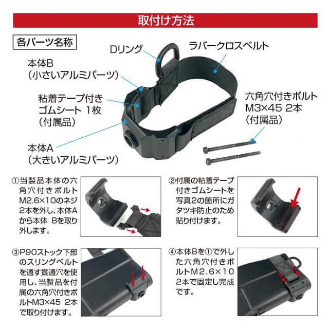 ※梱包時はP90本体左側面にDリングが配置されるように組立てられていますので、右側面にDリングを配置する場合は本体B(画像参照)とラバークロスベルトを逆向きにする必要があります。その際、ラバークロスベルトから本体B(画像参照)が抜けにくい場合があります。また、ラバークロスベルトに付いているベルクロは逆向きになります。