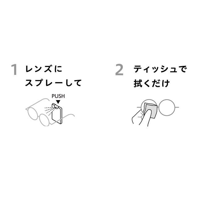 レンズ裏面にスプレーした後、指で表裏しっかりと塗り広げ、液が乾いてからティッシュなどで軽く拭き上げて下さい。レンズ1枚(表裏)に対して1プッシュが適量です。※極細繊維の布、保湿成分を含んだティッシュは使用しないで下さい。※クリーナー等との併用はお控えください。