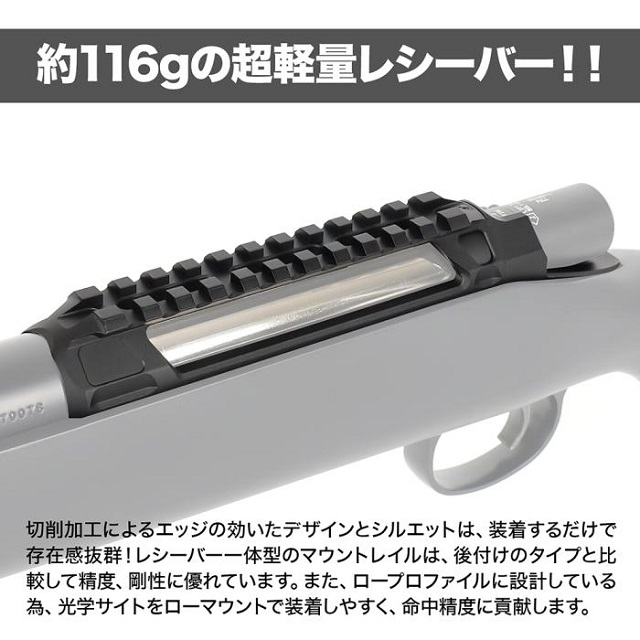 VSRシリーズ用のフル切削マウント一体型カスタムレシーバーです。切削加工によるエッジの効いたデザインとシルエットは、装着するだけで存在感抜群! 素材にはアルミ合金を採用しておりVSR-10 プロスナイパー Gスペック純正のレシーバー(約196g:マウントベース含む)と比較して約80gも軽量です。レシーバー一体型のマウントレイルは、後付けのタイプと比較して精度、剛性に優れています。また、ロープロファイルに設計している為、光学サイトをローマウントで装着しやすく、命中精度に貢献します。