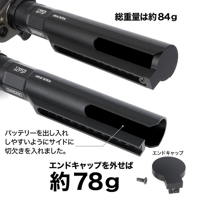 ライトウエイト12ポジションM4ストックパイプ(STD用) [LL-18400]] メーカー LayLax 品番 LL-18400 商品名 ライトウエイト12ポジションM4ストックパイプ(STD用) [LL-18400]] 定価(税込) ¥ 5,940 特価(税込) ¥ 4,752 送料区分 送料小② 送料小② 基本配送料:680円 数量が1点まで「送料小 680円」、2点につき「送料中① 935円」 利用規約(送料説明)の表示 ※詳しい送料説明 オンラインショップの在庫状況 オンラインショップ 在庫わずか 店舗別の在庫状況 大阪日本橋店 在庫切れ 東京秋葉原店 在庫わずか 福岡博多店 在庫切れ 【有料】ラッピングサービス ラッピングサービスを希望される場合は、商品と一緒に対応するサイズのラッピングサービスをカートに入れてご注文ください。 ラッピングをご希望の方はこちら 数量 個 この商品へのお問い合わせ ●約84g 超軽量化を実現! ●史上最多12ポジション M4系スタンダード電動ガン用の軽量かつ最適なポジション選択が可能なストックパイプです。アルミ全切削によるエッジの効いたデザインとシルエットは、装着するだけで存在感抜群! 今迄にないテイストのストックパイプとなっております。特にスタイリッシュなハンドガードやフレームにマッチします。 一般的なストックパイプの倍である12ポジションを選択でき、その時々の装備の微妙な厚さ違いに対応可能です。 軽さにこだわり総重量は約84g(スペーサー、ネジ含む)。エンドキャップを外せば約78gと軽量に仕上がっています。 エンドキャップを外した状態では、ストックの位置調整レバーを引っ張ることなくストックを取外せるため、バッテリーの交換が容易になります。また、バッテリーを出し入れしやすいようにサイドに切欠きを入れています。 ■対応機種 東京マルイ スタンダード電動ガン M16,M4シリーズ各種 ※装着するストックによっては調整、加工が必要になる場合がございます。 ■注意: ※画像はサンプル(試作)の為、実際の色や仕様と異なる場合がございます。 ※商品に銃本体及び、M4系のストック、その他のパーツ等は含みません。