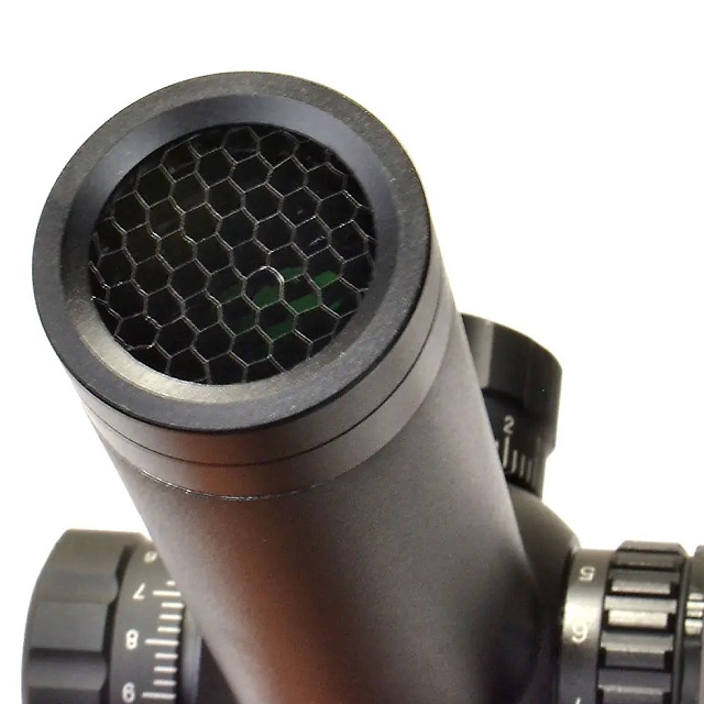 大きな変更点は、従来モデルより、各調整ノブのデザインとレティクルデザインが変更となっています。レティクルデザインは、センターのドットが光るミルドットタイプのレティクルを採用。また、レンズの反射を防ぐ効果と対物レンズを保護するハニカムサンシェードも付属します。