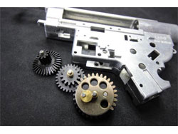 ギア比は東京マルイ次世代電動ガンに採用されているノーマルギアと同じギア比です。材質はスチール製となり、ギアクラッシュの発生が低く、高耐久を誇ります。