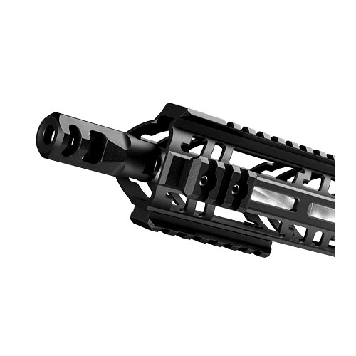 ●M-LOKレイルシステム:剛性が高いアルミ切削ハンドガードに、最新のレイルシステム「M-LOK(エム-ロック)」を採用。必要な部分にだけレイルを増設可能なハンドガードはスリムで扱いやすく、肉抜きによる軽量化もされています。幅20mm(ピカティニー規格)のM-LOKレイルは3スロット、5スロット、7スロットの3種類が各1枚付属。付属の六角レンチで簡単に脱着可能です。