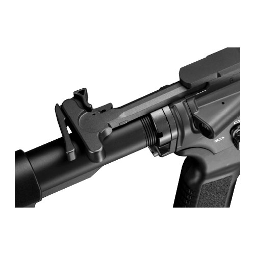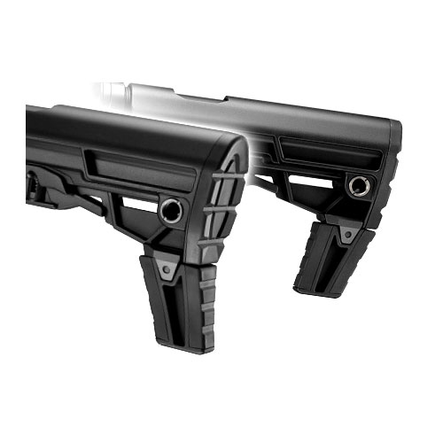 ●好みや状況に応じる操作性:チャージングハンドルをはじめ、各種操作レバーは左右どちらからでもアクセスできるアンビ仕様となっているほか、大型化によってグローブをした手でも確実な操作が可能です。ストックは、後端下部のエクステンションを前後反転させることで、身体に密着するコンケイブ(凹)型と銃口を上下に動かしやすいコンベックス(凸)型が選択でき、6段階の伸縮調整にも対応。グリップはストックを短くしても握りやすいバーティカル(垂直)デザインを採用しています。