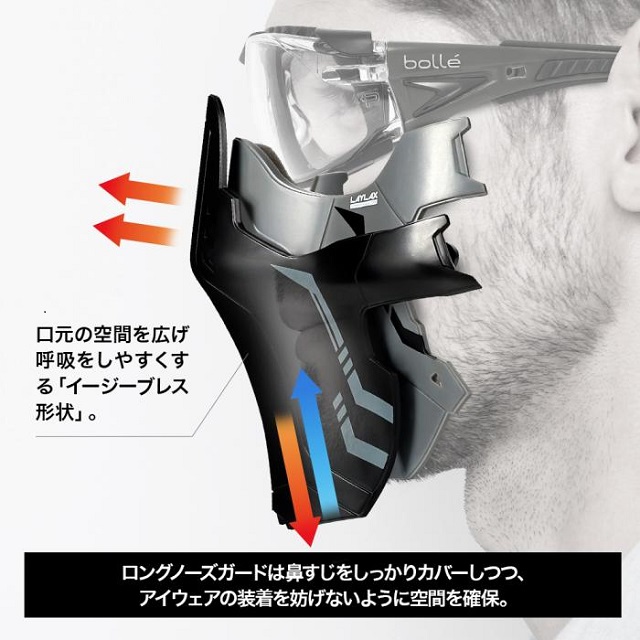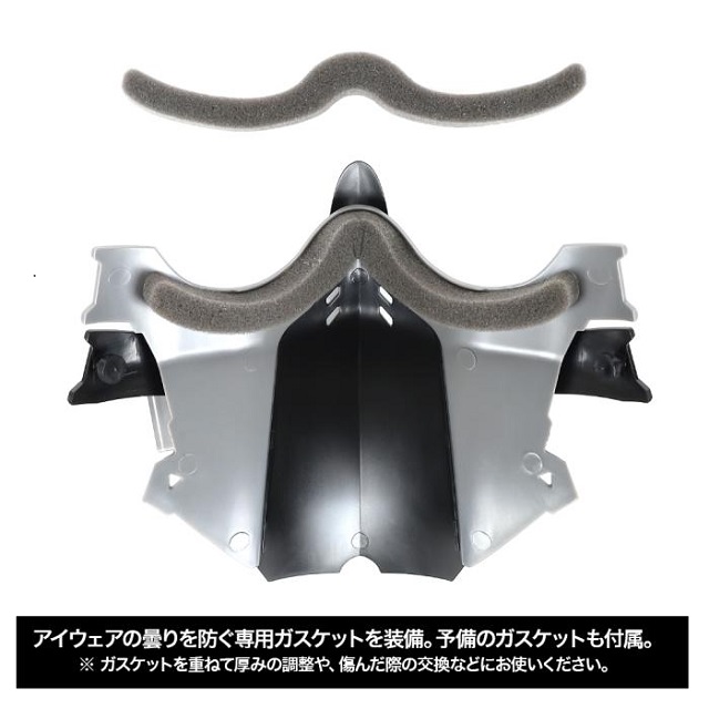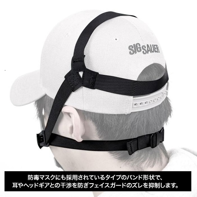 アーマーが二重に重なったようなSFスタイルのシャープなデザイン。本体の素材は警察のシールドにも採用されている「ポリカーボネート」製。布やソフトタイプのフェイスガードとは違い、弾の衝撃が突き抜けません。ロングノーズガードは鼻すじをしっかりカバーしつつ、アイウェアの装着を妨げないように空間を確保。更に、アイウェアの曇りを防ぐ専用ガスケットを装備し、予備のガスケットも付属しています。口元は空間を広げ呼吸をしやすくする「イージーブレス形状」を採用。ヘッドバンドにはラバークロスを使用。防毒マスクにも採用されているタイプのバンド形状で、耳やヘッドギアとの干渉を防ぎフェイスガードのズレを抑制します。