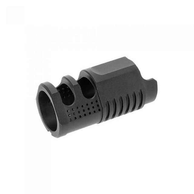 実銃では、フラッシュハイダーに被せることで、リコイル、マズルジャンプ(銃口が跳ね上がる現象)、横方向のブラストを軽減する目的があり、隠密性の向上や発射音による周囲への被害を抑える働きを持ち、伏せ撃ちなどの際に土埃で視界を遮らないようにする効果があるマズルデバイス。
