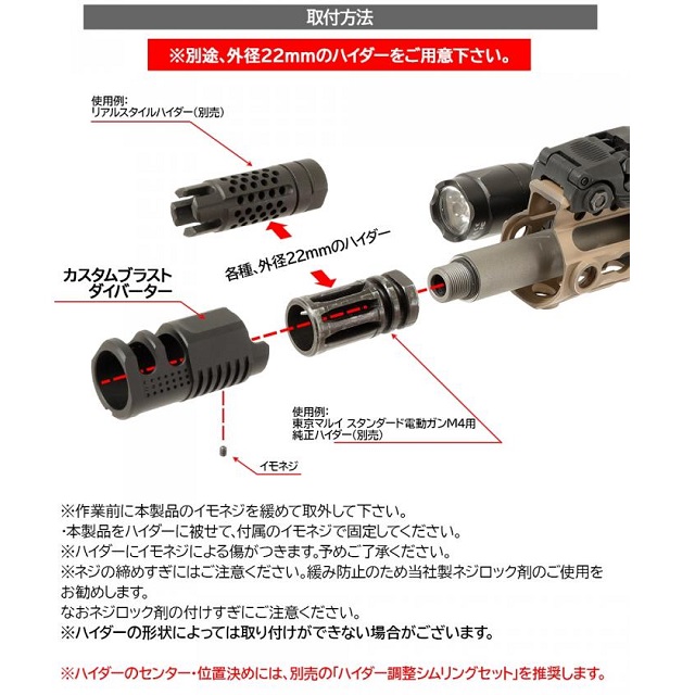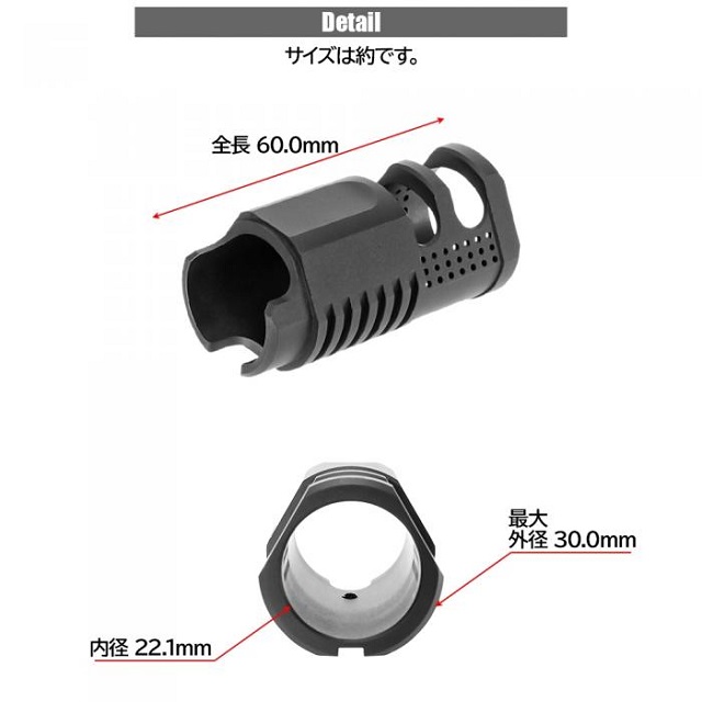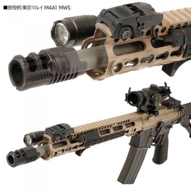 東京マルイ製のM4系に装着されているフラッシュハイダー(外径22mmのもの)等に取り付けできるドレスアップパーツです。