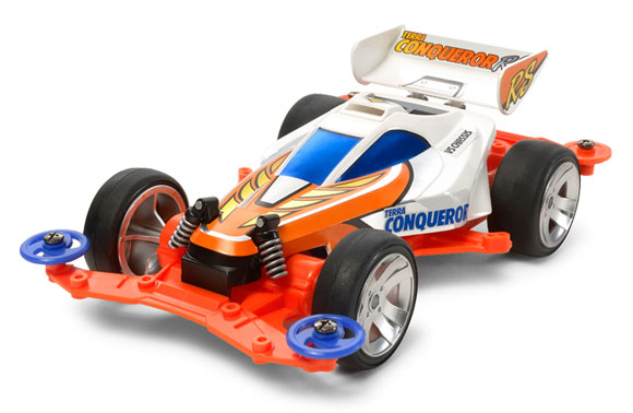 【 VSシャーシ 】 シャーシは小型・軽量でショートホイールベースが特長のVSを採用。シャーシ下面にエアダクトをあけてモーターの冷却効果を高め、フロントカバーとバッテリーホルダーはヒンジで開閉できます。コンカラーRSはシャーシ全体をオレンジとして、ボディのオレンジのグラフィックとカラーコーディネート。リヤローラーステーもオレンジカラーとしました。また、フロントにブルーカラーの16mmプラローラーを装備。マットクロムメッキ仕上げの大径4本スポークホイールにはレーシングスリックタイヤを装着しました。4.2:1のスピードギヤ付き。