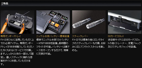 ●最大14ch(12+2ch)/●設定用タッチセンサ+プッシュ・スイッチ2ケ●2.4GHz FASSTest(14ch/12chモード切替),FASST(マルチ(14ch)/7chモード切替),S-FHSS(8ch)方式対応●30モデルメモリー●128x64ドット、LEDバックライト付モノクロLCD●日本語カタカナ/英語、他7ヶ国一部対応●2.4GHz専用アンテナ●モニタLED(赤・青、各1ケ)●左右スライド・レバー●デジタル・トリム●SDカードスロット(カード別売)●ニッケル水素電池6.0V/1,800mAh●モデル・メニュー(飛行機/ヘリ/グライダー)●トレーナー●ユーザネーム/モデルネーム(10文字/10文字)●ブザー(ON-OFF設定可能)●スティックキャリブレーション●サーボ・モニタ●サブトリム●リバース●フェール・セーフ●エンド・ポイント(ATV)●サーボ・スピード●トリムメモリー●データ・リセット●アップ/ダウンタイマー●D/R●プログラム・ミキシング●スロットル(モーター)・カーブ5ポイント●ユーザメニュー●クイックモデルセレクト●S.BUSサーボ・プログラミング(S9070SBを除く)●テレメトリ機能【飛行機/グライダー共通】●エルロン・ディファレンシャル●フラップ設定●エルロン→キャンバーFLP●エルロン→ブレーキFLP●エルロン→ラダー●キャンバー・ミキシング●ELE→キャンバーFLP●キャンバーFLP→ELE●ラダー→エルロン●ジャイロ感度●Vテール●エルベータ●ウィングレット●モーター(EPプレーン/グライダー用)【飛行機専用】●スロットル・カット●アイドル・ダウン●ピッチ・カーブ(VPP)5ポイント●3VPPコンディション(ピッチ・カーブ/スロットル・カーブ)●ラダー→エレベータ●スナップ・ロール●エアブレーキ●フューエル・ミクスチャー【グライダ専用】●5コンディション選択●コンディション・ネーム(8文字)●バタフライ●トリム・ミックス【ヘリ専用】●5コンディション選択●コンディション・ネーム(8文字)●スロットル・カット●スワッシュ設定●ピッチアジャスト機能●スワッシュリング●ピッチカーブ5ポイント●スロットル・カーブ5ポイント●スロットル・リミッタ●スロットル・ホールド●スワッシュ・ミキシング●スロットル・ミキシング●ピッチ→ラダー●フューエル・ミクスチャー●ジャイロ感度(CGY750ヘリ用3軸ジャイロ対応)●ガバナー設定