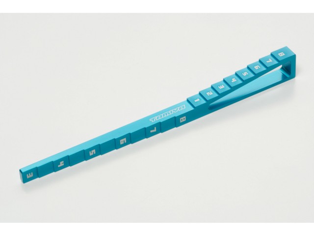 ツーリングカーのハイト(車高=最低地上高)と、ドゥループ(サスペンションが下がる量)が計測できるゲージです。特にドゥループ量は、現在のツーリングカーのセッティングで重要なポイントとなっている、サスペンションのリバウンド量の目安になります。ブルーアルマイト処理されたアルミの削り出し製。レーザー加工により数字やロゴを彫り込んだ高品質な仕上がりも魅力です。