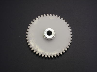 歯車はポリアセタール樹脂 3mm 板材より、レーザー加工により1ケづつ切り出され中心にアルミ切削品のボスを打ち込んでいます。