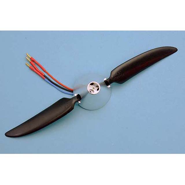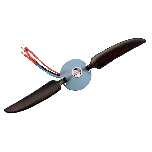 スピンナーと一体になった本体ユニットからはモーターのリード線3本が出ているだけ。胴体やカウルの中にはモーターが全く出ないので、メカの搭載が難しいグライダーやスケール機への利用などアイデアは拡がる。