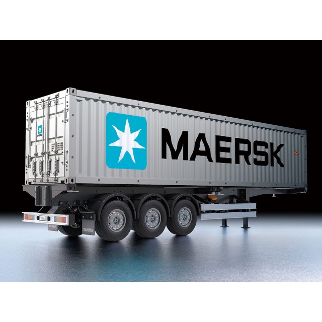 【 世界の物流を支える頼もしい姿を再現 】 国際的な統一規格が設けられ、世界の物流を支えている海上貨物用コンテナ。中でも40フィート(約12m)のコンテナを搭載したセミトレーラーを再現した組み立てキットです。アルミフレームとABS樹脂製波板で構成されたコンテナはリアルな仕上がりに加えて、シャーシから取り外し可能。世界最大規模の海運会社、マースク「MAERSK」のロゴステッカーもセットしてムードを高めます。シャーシはアルミ製サイドフレームに樹脂製クロスメンバーを組み合わせ、リーフスプリングを平行に配置したトリプルスプリングの3軸サスを装備。組み立ての手応えはもちろん、1/14RCビッグトラックシリーズに揃ったトレーラーヘッドと連結しての堂々とした走りが楽しめます。