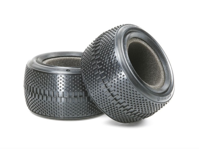 正方形と長方形の2パターンのブロックを配したバギー用リヤタイヤです。ハイグリップコンパウンドの使用により、硬く締まったオフロード路面で優れたグリップを発揮します。