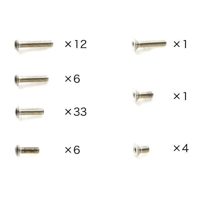 3×8mm丸ビス6本、3×10mm丸ビス33本、3×12mm丸ビス6本、3×15丸ビス12本、3×6mm皿ビス4本、3×8mm皿ビス1本、3×16mm皿ビス1本