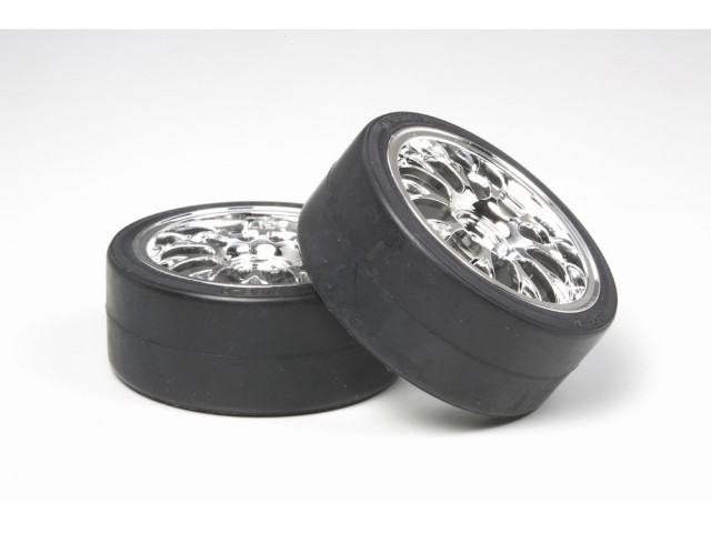 きらびやかなメッキ加工が施されたメッシュデザインのホイールに、ドリフトタイヤをセット。スリリングなドリフト走行をいっそう鮮やかに見せます。1/10ツーリングカー各車に使用可能。