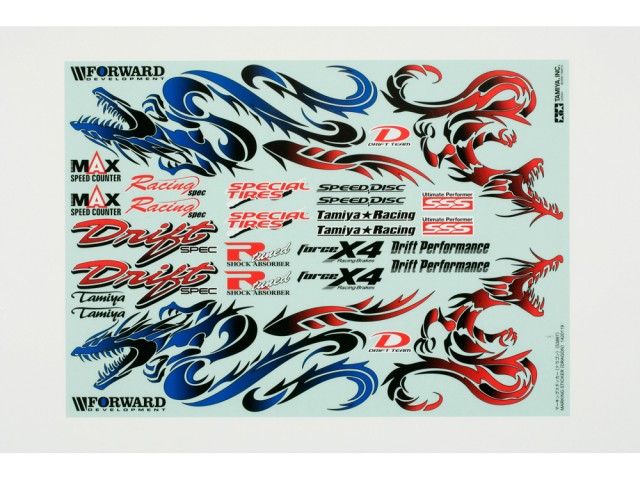 レッドとブルーのステンシル調のドラゴン模様に加えて、ドリフトパフォーマンスやスペシャルタイヤなどの英文字のロゴを用意しました。ツーリングカーやモンスタートラックなどのボディに貼るだけで、マシンのイメージを一新させてくれます。