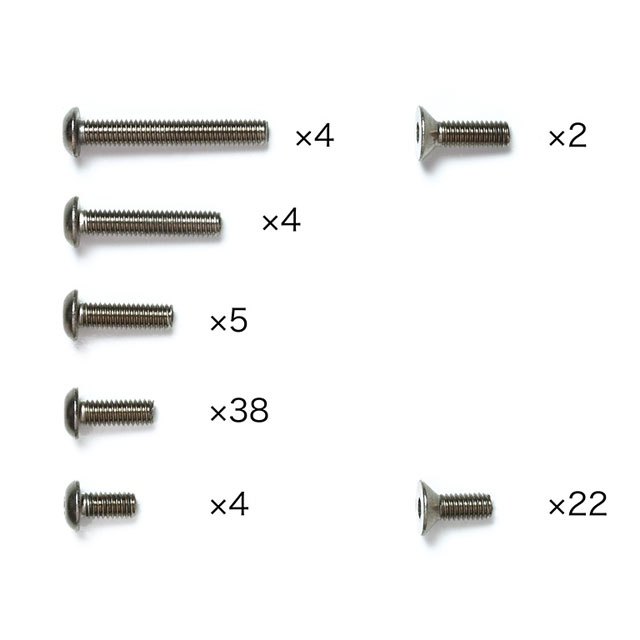 3×8mm六角丸ビス(チタン)38本、3×10mm六角皿ビス(チタン)2本、3×8mm 六角皿ビス(チタン)22本、3×20mm 六角丸ビス(チタン)4本、3×6mm 六角丸ビス(チタン)4本、3×10mm 六角丸ビス(チタン)5本、3×15mm 六角丸ビス(チタン)4本 合計79本のビスをセット