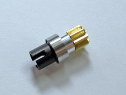 真鍮削りだしの高精度ハードジョイントギヤ。シャフトとのスリップを無くし、確実にフロントホイールに確実に駆動力を伝達する。
