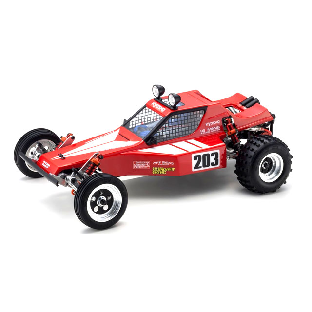 優れた基本コンポーネンツを有するスコーピオンをベースに、よりレースに特化した純競技車両として数々のモディファイを行い、1983年に登場したトマホーク。発売と同時に国内/海外のオフロードレースシーンを席巻、その活躍は今でも多くのR/Cカーフリークの記憶に刻まれていることでしょう。そんな強烈なインパクトを放った不朽の名車が、復刻を望んでやまない数多くの京商ファンのリクエストに応えるカタチで、ビンテージシリーズ第3弾モデルとして復活を果たしました。シャシーは6061T6アルミ製メインフレーム&鍛造サスペンションアームや、ギヤデフ内蔵2ピースアルミダイキャスト製ギヤボックスなど金属パーツを惜しみなく投入したスコーピオン2014を踏襲しながらも、純レーシングバギーとしての地位を不動のものにすることとなったトマホークならではのスパルタンなダブルデッキスタイルを忠実に再現。もちろん、オリジナルモデルをそっくりそのまま再現するのではなく、現代のR/Cサーキットでの走行や最新パワーソースの搭載を視野に入れた各部のブラッシュアップも図っています。ファン待望の復刻モデルの登場なだけに『眺めて楽しむ』という人も決して少なくないかもしれませんが、トマホークはメカボックスを廃したことによる大幅な軽量化に加え、バッテリーの横置き搭載による最適な重量バランスの獲得によって純レーシングバギーならではのシャープな走りを身上とするマシンなだけに『走らせて楽しむ』ことをお勧めします。