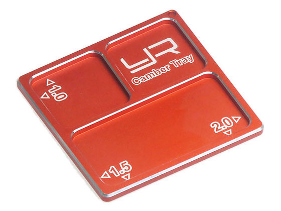 シャーシのセッティング時にはキャンバー角度の1.0°、1.5°、2°を測定でき、シャーシのメンテナンス時には、ネジや小さな部品のトレイとして作業効率があがります。