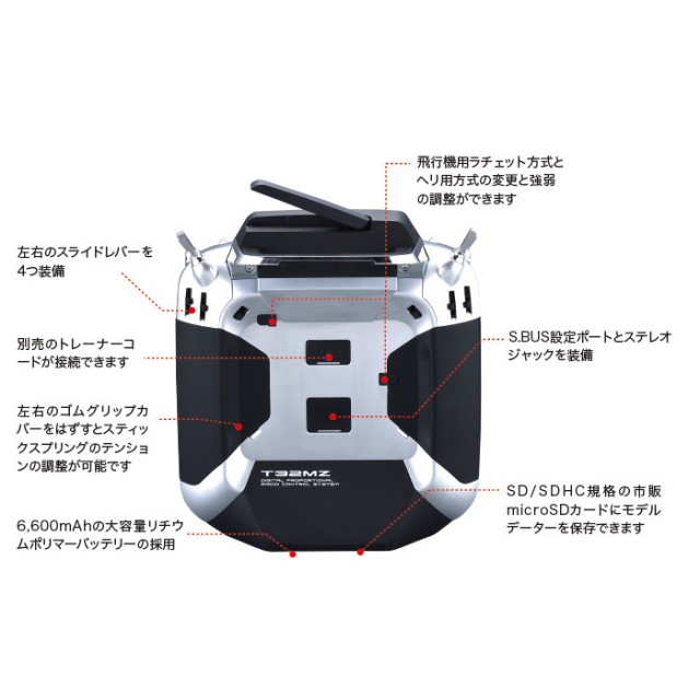 ●WindowsCE採用●2.4GHz FASSTest、FASSTマルチ、FASST7ch、S-FHSS/T-FHSS方式対応●2.4GHz専用機●GPS内蔵●モニターLED●スイッチレバー交換式●左右スライドレバー(S/ST)●デジタル・トリム●タッチ・パネル●エディットボタン●SDカードスロット●送信機用リチウムポリマー電池LT1F6600B装備●ツール・ボックス●ユーザー名登録/文字入力●音楽再生●トレーナー●画像●サウンド●サブトリム●リバース●フェール・セーフ●エンド・ポイント(ATV)●スロットル・カット●アイドル・ダウン●スワッシュ設定(ヘリ専用)●タイマー●ダイヤル・モニタ●データ・リセット●サーボ・モニタ●コンディション選択●AFR(D/R)●プログラム・ミキシング●フューエル・ミクスチャー(飛行機、ヘリ専用)●エルロン・ディファレンシャル●フラップ設定●エルロン→キャンバーFLP●エルロン→ブレーキFLP●エルロン→ラダー●エアブレーキ→ELE●ラダー→エルロン●キャンバー・ミキシング●ELE→キャンバーFLP●キャンバーFLP→ELE●バタフライ●トリム・ミックス●エアブレーキ●ジャイロ感度操作●Vテール●エルベータ●ウイングレット●ラダー→エレベータ●スナップ・ロール(飛行機専用)●マルチ・エンジン(飛行機専用)●ピッチ・カーブ●スロットル・カーブ●アクセラレーション(ヘリ用機能)●スロットル・ホールド(ヘリ用機能)●スワッシュ・ミキシング(ヘリ用機能)●スロットル・ミキシング(ヘリ用機能)●ピッチ→ニードル(ヘリ用機能)●ピッチ→ラダー(ヘリ用機能) ●テレメトリーログ機能●マルチプロップ機能(オプションのMPDX-1を使用して32chに対応)