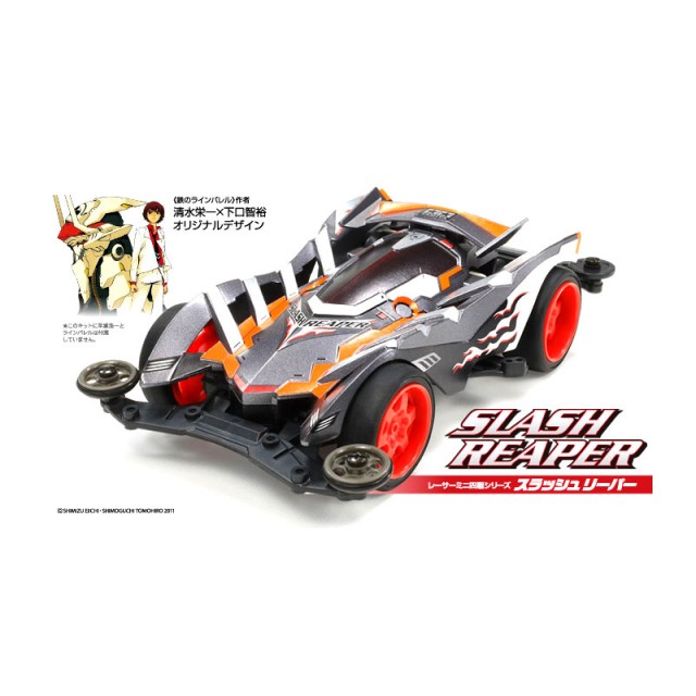 鎌をイメージしたサイド部分の穴あき加工された形は、軽量化はもちろん内部メカの冷却効果をアップ。ボディはMSシャーシやスーパーIIシャーシにも搭載できます。シャーシは軽量・コンパクトでシャープな走りを生み出すVSを採用、レッドの大径ホイールに大径タイヤを装着、幅広いタイヤセッティングも可能です。さらに4.2:1のギヤを装備し、ゴムリング付きの16mmプラスチックローラーをセット。パッケージは清水×下口両氏の描き下ろしイラストレーション仕様で、スペシャル感あふれる仕上がりです。