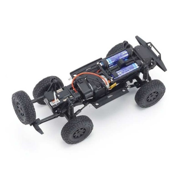 いっぽう、実車と同様のラダーフレームを採用した4WDシャシーにはロングストロークを誇り、アッパーAアームと3リンク式リジッドアクスルサスペンションが組み込まれ、ステアリングサーボもハイトルクタイプのミニッツ4×4専用品を装備。通常走行はもちろんのこと、ロッククローリングフィールドを彷彿させるような障害物のある悪路でも難なくクリアするだけの走破性を兼備しています。低~中速域のトルク特性に優れる専用130モーターもミニッツ4×4がもつ走行パフォーマンスをいっそう引き出します。
