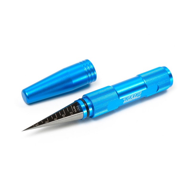 ポリカーボネート製ボディの穴開けに便利なリーマーです。切れ味鋭い工具鋼の刃部には3mm~13mmまでの直径目盛りをレーザー彫刻。ブルーアルマイトのグリップにはホワイトでTRFのロゴを彫刻した高品質な仕上がりです。工具箱などに入れる際に刃の部分を全てカバーするアルミ製キャップ付き。