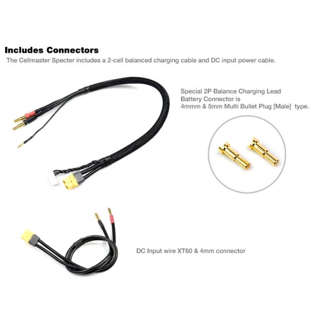 セルマスター Spectreには、2セルバランス充電ケーブルとDC入力電源ケーブルが含まれています。