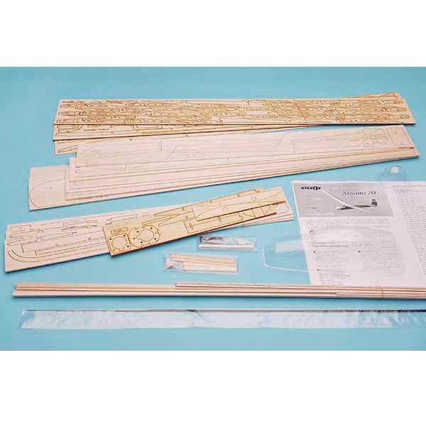 「セサミ70」は国内で加工された木部部品と図面で構成されたバルサ組立キットです。レーザーカットにより正確に加工された部品は、短時間で正確に組み上げることが出来ます。長年のレーザーカットキット製造の経験とグライダー設計のノウハウを集めた「セサミ」は、軽量であることは勿論、組み立てやすさに重点を置き、レトロ感あふれた設計となっています。