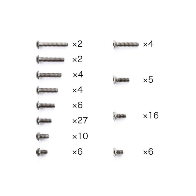 軽量で強度の高いチタン製のビスセット。標準装備の主要なスチール製ビス92本をチタン製に変えることで約20gの軽量化を実現します。3×5mm六角チタン丸ビス6本、3×6mm六角チタン丸ビス10本、3×8mm六角チタン丸ビス27本、3×10mm六角チタン丸ビス6本、3×12mm六角チタン丸ビス4本、3×14mm六角チタン丸ビス4本、3×16mm六角チタン丸ビス2本、3×18mm六角チタン丸ビス2本、3×6mm六角チタン皿ビス6本、3×8mm六角チタン皿ビス16本、3×10mm六角チタン皿ビス5本、3×16mm六角チタン皿ビス4本をセットしました。