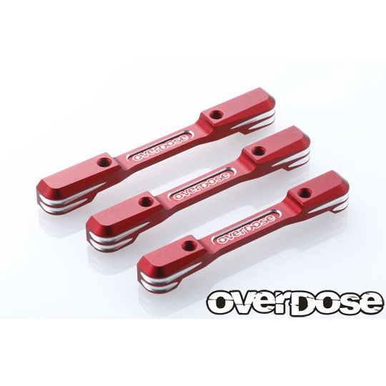 OD サポートドライバーTAKE-C のプロデュースによるアルミサスマウントです。従来のアルミサスマウントに対して2.5mm のローマウントが可能。これにより重心位置を変えることなくロールセンターと重心の距離を大きく設定することができ、車体がロールする力を有効にタイヤへ伝えることが可能となります。このことから、ドリフト中に於いても適度なグリップを残した状態になりコーナリングスピード, コーナー立ち上がりでのトラクション性能を大幅に向上させることが可能となります。サスマウントの幅は、43.7mm, 48.2mm, 52.7mm の3 種類を設定。43.7mmを基準に48.2mm, 52.7mm を組み合わせることでトレーリングアングル3°, 6°に設定可能。また、サスアームの前後で同じ長さを使用することでワイドサスマウントとして使用することも可能です。43.7mm, 48.2mm, 52.7mm 各1 本入り。カラーはパープル, レッド, ブラックをご用意致しました。