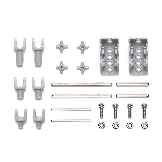 RCカーのドライブシャフトなどでもおなじみの、ユニバーサルジョイント。シャフトの回転を、角度や段差が付いた状態で伝えることができる組み立て式の連結パーツです。クロススパイダーと呼ばれる中央の十字型パーツを、ジョイントカップ先端のヨークと呼ばれる二股になった部分で挟み、左右のジョイントカップを連結。最大45度の角度が付いた状態で動力を伝えることができます。ジョイントカップは差し込むシャフトに合わせて3種類用意。3mm六角シャフトをはじめ、テクニクラフトの4mm丸シャフト、ミニ四駆などの2mm六角シャフトが使えます。また、3種類のジョイントカップは同じ形なので、違う種類のシャフトを接続することも可能。ジョイントカップとクロススパイダーははめ込み式で手軽に組み立てられます。