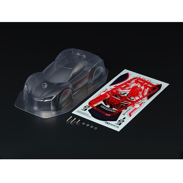 カーデザイナーとして活躍する根津孝太氏(znug design代表)の手になる、滑らかな3ボックス・クーペフォルムが特徴のライキリ。実車のムードあふれるスタイルが走りを強調するポリカーボネート製クリヤーボディです。標準仕様のABS樹脂製ボディに比べて60%以上の軽量化を実現。マシンの低重心化にも効果が高く、コースアウトなどの衝撃に強いのもポイントです。クリヤータイプの専用ステッカーをはじめ、クリヤーレッドのABS樹脂製ボディマウント、マウント取り付け用ビスもセットしました。MA、MSシャーシに搭載可能。