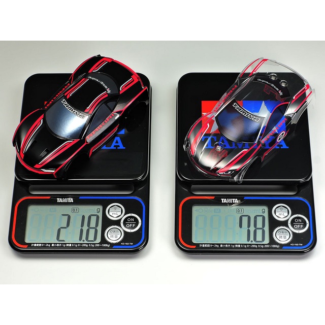 ABS樹脂製ボデイ(左側)に比べ、大幅に軽いポリカーボネート製ボディ(右側)。