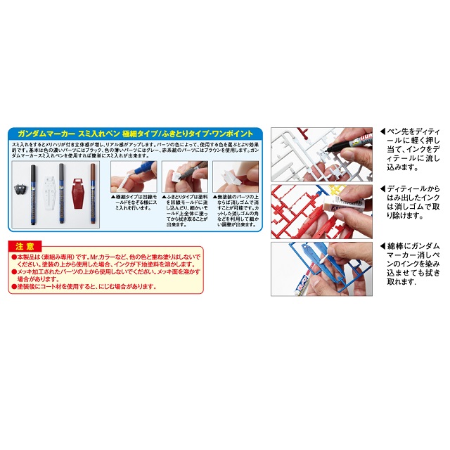 ・ガンダムマーカー塗装用やMr.カラーなど、他の色と重ね塗りはしないでください。塗装の上から使用した場合、インクが下地塗料を溶かします。