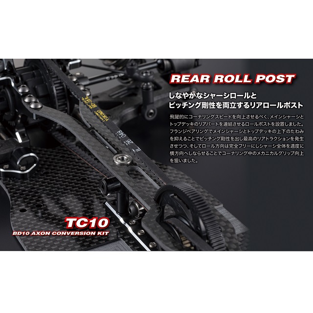 アクソンコンバージョンTC10は、高性能なBD10の良さを活かし更なる限界を求めて開発し、常識を打ち破る進化を達成しました。圧倒的なレスポンスのいい走りを実現させるべく、新たに前後ショックタワーをローマウントデザインとしました。そしてその性能をいかんなく発揮させるために、ハイビックボアタイプのNEWスーパーショートダンパーを開発。更に独自デザインによるカーボン製メインシャーシとトップデッキを新たにデザインしシャーシロールとピッチング剛性の最適化を図りました。