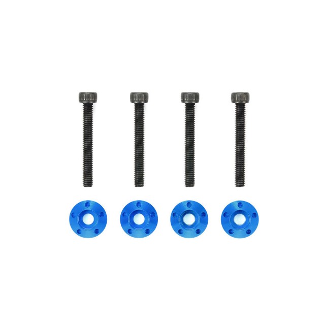 ブルーアルマイト加工されたアルミ製カラー4個と2.6×20mmキャップスクリュー4本をセット