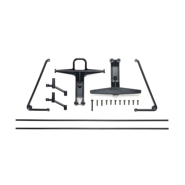 車体のフロント部、サイド部を保護するバンパー部品です。往年の1/10RCバギーに装着されていたフロントバンパーやサイドガードをモチーフに、タムテックギア用にアレンジ。バンパーはフラットバー形状とアニマルバー形状の2種類を用意しました。取り付け用ビスやアンテナパイプ(ブラック)もセット。