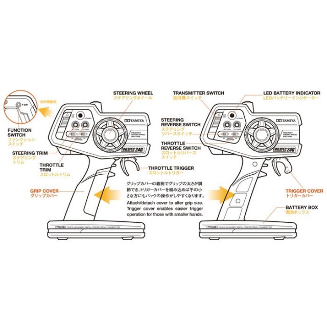 【 基本スペック 】 ●送信機用電源:単3形電池4本(別売) ●ESC&受信機用電源:走行用バッテリーと共用(レギュレーター回路内蔵) ●指定走行用バッテリー:タミヤ走行用バッテリー各種 ●ESC:タミヤTBLE-04S 連続最大電流:75A ●使用モーター:540タイプ(25ターン以上)、スポーツチューン ※別売のセンサーコード(ITEM54317、54318、54381)を使用することで15.5T(巻線数)以上のタミヤブラシレスモーター・センサー付き(TBLMシリーズ)にも対応。
