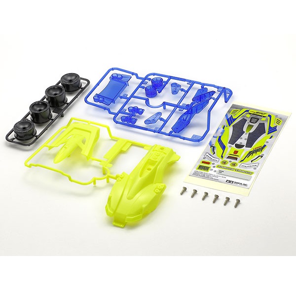 コロコロコミックにて好評連載中の『MINI 4 KING』に登場する主人公マシン、ロードスピリットのボディパーツセットです。マンガの舞台である熱海の美しい夜景を、蛍光イエローカラーのボディで表現。また、走行安定性を高めるロードスピリット専用パーツはクールな印象のクリヤーブルー、ホイールはシックなブラックとして、カラーコーディネートのバリエーションがぐっと広がります。さらに、イエローにブルーのグラフィックが映える、ボディカラーと合わせた専用ステッカーも用意。お好みのVZシャーシと組み合わせることで、ノーマルバージョンとはひと味違ったロードスピリットが完成します。
