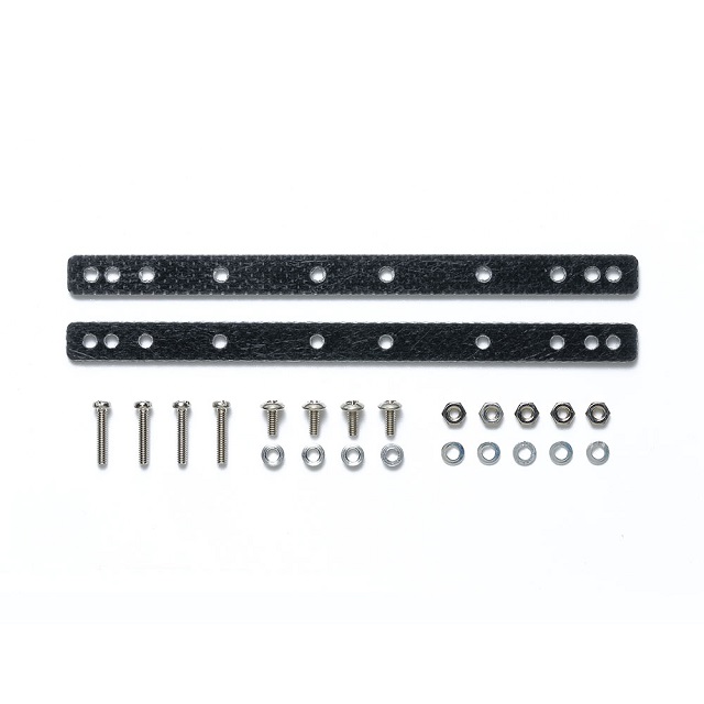 様々な改造に使用できるストレートバー形状のFRPプレートです。13mmまたは19mmのローラーを規定幅いっぱいに取り付け可能。厚さ約1.5mmのFRPプレート2枚と、取り付け用のビス、ナットをセットしました。※ITEM:15497 HG 13・19mmローラー用 カーボンマルチ補強プレート(1.5mm)と同じ形状です。