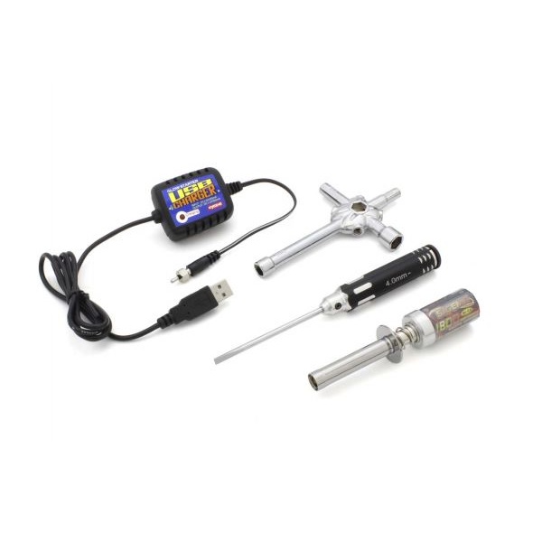 グローエンジン(模型用エンジン)は、グロープラグを発熱させると同時にフライホイールを回し圧縮を高め混合気に点火させて始動します。その際に必要なのがグロースターター(別名:プラグヒータ)です。本製品はエンジン始動に必要な充電式グロースターター(1800mAhニカドバッテリー内臓)・専用USB充電器・プラグの脱着にも使用可能な十字レンチ(5.5/7.0/8.0/10mm)・エンジン調整に最適なサイズの4mmマイナスドライバーをワンパッケージにした始動用具セットです。組み立て済みのレディセットはもちろん、エンジンモデルの組み立てキットにもお薦めです。