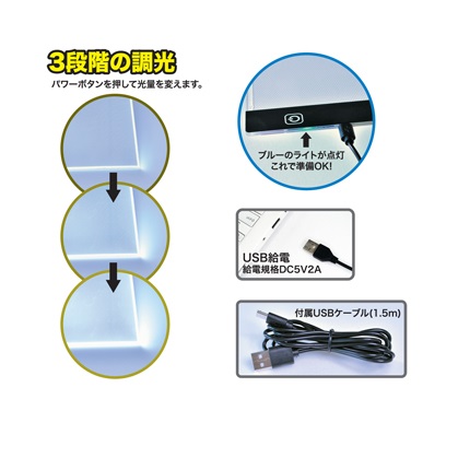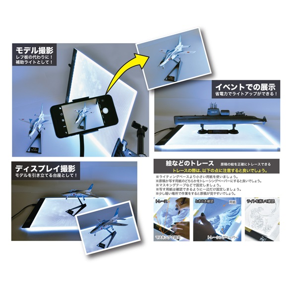 | 特徴 | 凄!ホビー用 ライティングベースが新しく仲間入りします。サイズはA5・A4の2展開となっており、電源につなぐとすぐに使用できます。明るいLEDタイプで3段階の調光が可能!厚さ4mmの薄型設計のため収納や持ち運びにも便利です。お手本を透かしてイラストのデッサンはもちろん、完成したプラモデルを照らしたり、レフ版としても応用ができます! ■USBケーブル付属(1.5m) ■電源:USB給電式 ■入力:DC5V 2Aまで |