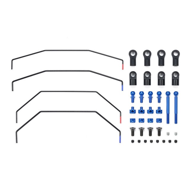 【 基本スペック 】 2種類の硬さの前後スタビロッドをはじめ、5mmアルミ六角ピロボール(ブルー)や5mmアジャスター、アルミスタビライザーエンド(ブルー)、3mmイモネジなどもセット。