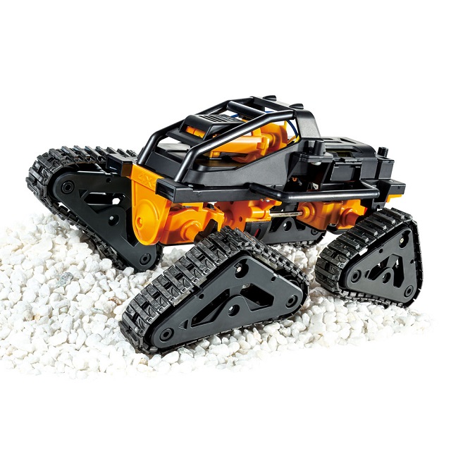 タイヤの代わりに前後で大きさが異なる三角形のクローラーを装着して、大きな凸凹も軽々乗りこえる、頼もしい走りが魅力の工作セットです。高い走破性の秘密は2種類の動き。4つのクローラーはそれぞれ独立して前方にスイングし、フロントアクスルはプロペラシャフトを軸に回転するように可動。地形に合わせて足まわりが動くことで、路面にしっかりとパワーが伝わります。また、24mmという余裕たっぷりの最低地上高もポイント。車体下部のギヤボックスはカバー付きなので、雪上や岩場など屋外走行もバッチリです。もちろん、家の中にあるものを障害物にしてコースを作るのも楽しみ。ブラック&オレンジカラーに身を包んだ、いかついスタイルでどんどん難関を突破する姿に元気をもらえることうけあいです。