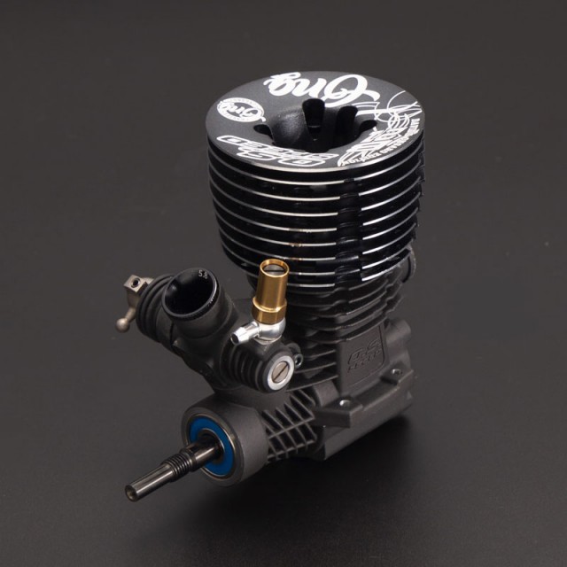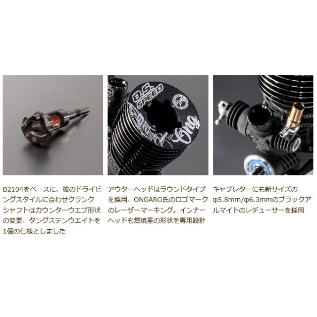 最新オフロードエンジンのO.S.SPEED B2104をベースに、彼のドライビングスタイルに合わせクランクシャフトはカウンターウエブ形状の変更、タングステンウエイトを1個の仕様としました。インナーヘッドも燃焼室の形状を専用設計し、これらの相乗効果によりスムーズなフィーリングと高回転の伸びを実現しています。