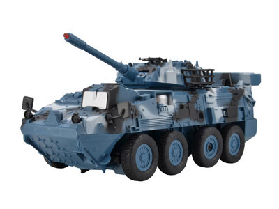 赤外線バトルのラジコン第2弾は8輪装甲車です。全長約21cmの8輪装甲車で、グリーン迷彩とブルー迷彩の2色展開です。2台の異なる周波数で、赤外線バトルが楽しめます。タンクよりも機動性が高いので、より白熱の対戦になるかも!?前進後退、左右旋回、エンジン始動アクション、砲塔旋回、機銃射撃、主砲は音と光と反動の砲撃アクションという1台でも十分に楽しめる充実ファンクション。
