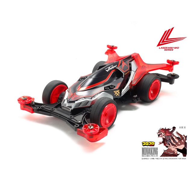 コロコロコミックにて連載中の『MINI 4 KING』(原案:武井宏之 漫画:今田ユウキ)で大興奮の走りを見せるマシンがレーザーミニ四駆です。武井宏之先生がデザインを手がけたマシンたちは、個性を強力にアピールする専用パーツを搭載しているのが特徴。専用パーツはビス止めで手軽に取り付けできるシンプルな構造ながら、グレードアップパーツに引けを取らない効果を発揮して、ハイレベルな走行が楽しめます。さらに、マシンによってパーツの形状や特性、カラーリングは様々なので、コレクションとカスタマイズの面白さもいっぱい。『MINI 4 KING』のストーリーと合わせて大注目のシリーズです。